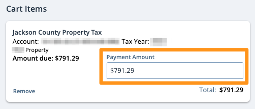 Jackson County property tax bills can be paid in full or in part on myJacksonCounty. As you go through the process of making your payment (see Pay a Jackson County Property Tax Bill on myJacksonCounty), you will have the option to enter a partial amount.