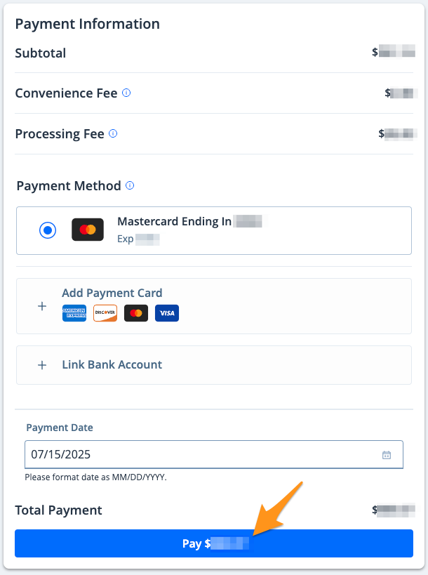 3. Select a payment method then click the blue Pay $--.-- button to complete your payment
